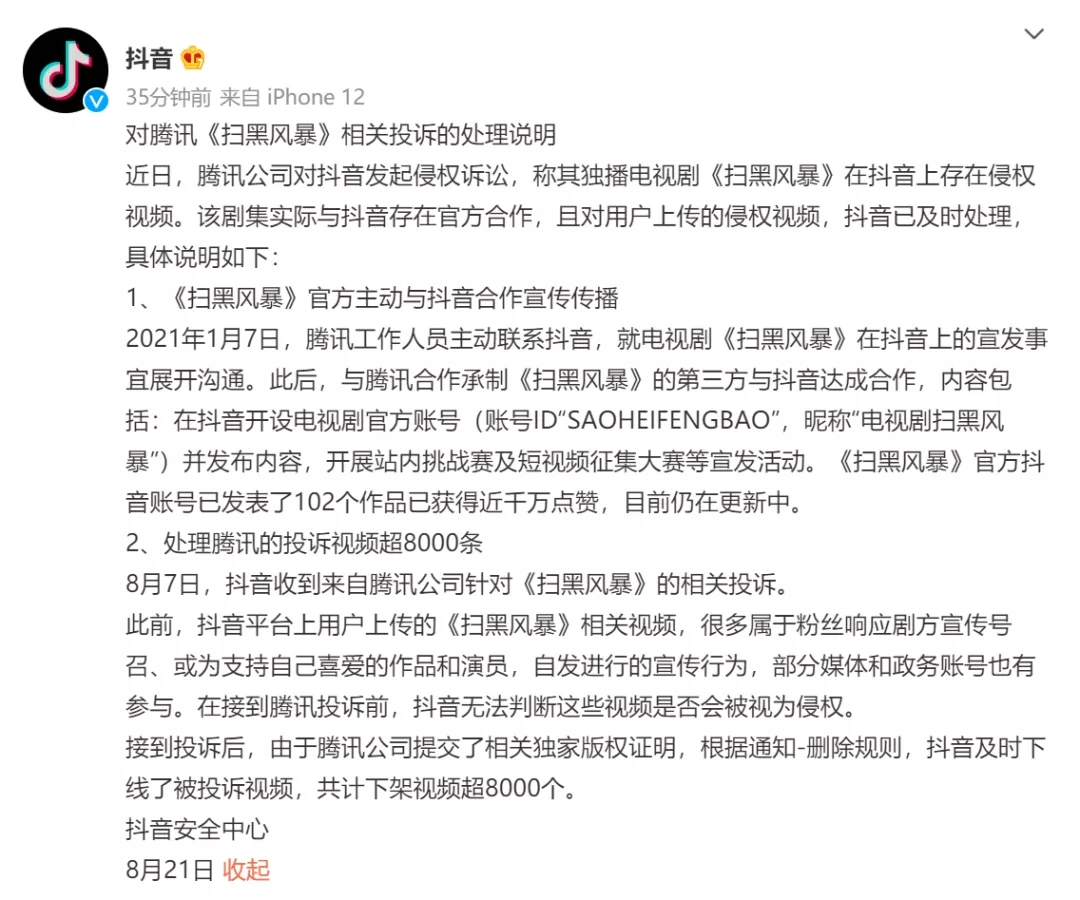8月21日下午,抖音官方微博发布声明:近日,腾讯公司对抖音发起侵权诉讼,称其独播电视剧《扫黑风暴》在抖音上存在侵权视频。该剧集实际与抖音存在官方合作,且对用户上传的侵权视频,抖音已及时处理,具体说明如下:1、《扫黑风暴》官方主动与抖音合作宣传传播;2、处理腾讯的投诉视频超8000条。
